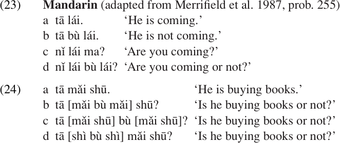 Mandarin has two basic strategies for forming Yes–No questions. One involves the use of a sentence-final particle ma (23c), while the other involves a kind of alternative question which is sometimes referred to as the “A-not-A” pattern (23d). As (24) shows, the alternative can involve either are petition of the verb alone (24b), of the verb plus object as a unit (26c), or of the copular verb shì ‘is’(24d).