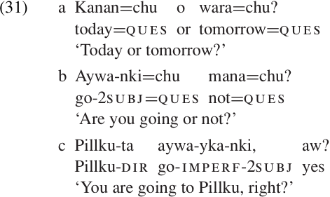 Yes–No questions in Quechua are marked by a clitic particle=chu. If this clitic attaches to the verb, as in (30b), the entire proposition is being questioned. But often the clitic attaches to another element in the sentence, as in (30c). In this case the constituent which hosts the clitic is the focal element of the question: the rest of the proposition is assumed to be true, and the questioner is asking only whether this particular piece of information is correct.