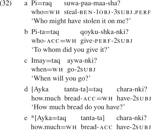 In content questions, the question word normally occurs at the beginning of the sentence, and is marked by another interrogative clitic. This Wh-clitic has two variant forms: =taq and =raq. If the question word is part of a larger constituent (e.g. ‘how much bread’ in (32d)), the Wh-clitic attaches to the end of the entire constituent and never to the question word itself (32e).