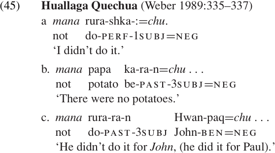 Finally, it is not uncommon to find negation indicated by a pair of markers. In Quechua, for example, the most common pattern of clausal negation involves the free form mana ‘not’ plus a clitic particle =chu ‘NEG.’ The particle =chu may occur on the main verb, as in (45a, b), or may attach to the focused element as in (45c).