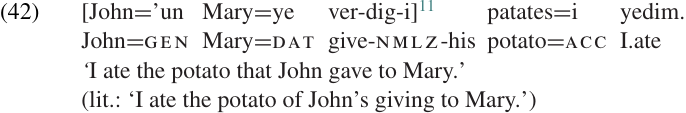 Aside from the prenominal order, there is another important difference between the Turkish example in (42) and the English examples in (35–41). In English relative clauses, the modifying clause contains a normal finite verb form, fully inflected for tense and agreement. In Turkish, however, the verb inside the modifying clause must be NOMINALIZED; that is, it is changed into a form which belongs to the category N.12 Because of this change, the subject of the modifying clause is marked for genitive case, rather than the expected nominative. This kind of prenominal relative clause, with a nominalized verb form and a genitive subject, is found in a number of other SOV languages as well.