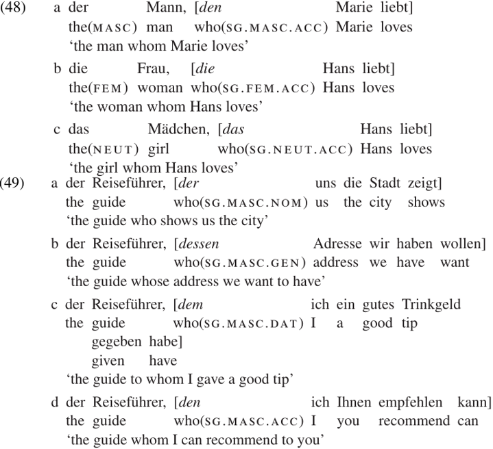 The case and agreement features of the relative pronoun are much more obvious in other languages. German provides a very clear example. The German demonstrative pronouns (der, die, das ‘that one’) also function as relative pronouns.2 A relative pronoun agrees with the head noun for gender and number, while its case marking indicates the Grammatical Relation which the head noun is understood to bear within the modifying clause. The examples in (48) illustrate agreement with the grammatical gender of the head noun, while (49) illustrates the change in case marking.3