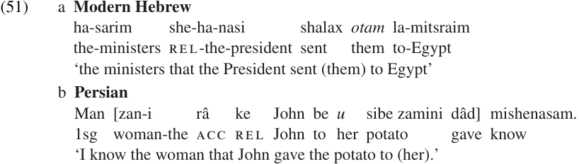 This pronominal copy is often called a RESUMPTIVE PRONOUN. The examples in (51) are from Keenan (1985:146).