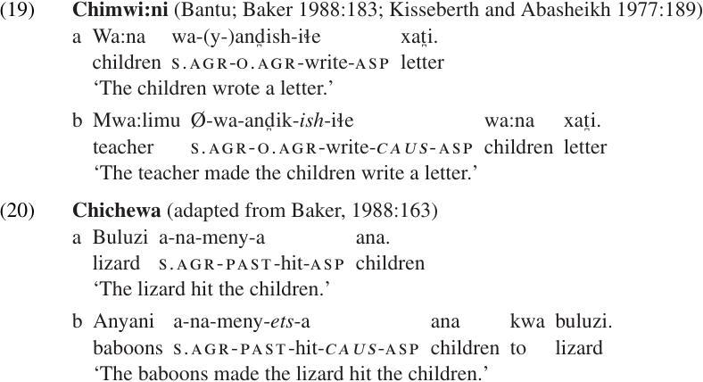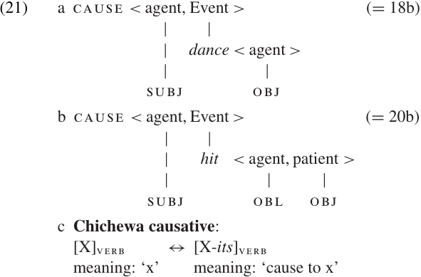 A simple WFR expressing the function of the Chichewa causative suffix is presented in (21c). The changes in argument structure and Grammatical Relations can be fairly complex, so we will simply write out the change of meaning in words.