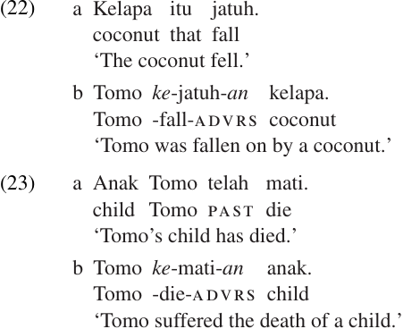 Another type of derivational process which changes the argument structure of the verb is the ADVERSATIVE. In Malay, the ke-X-an circumfix which we saw functioning as a nominalizer can also be used to form adversatives, as shown in (22) and (23). As these examples illustrate, the adversative construction changes an intransitive root into a transitive verb by adding a new argument, namely the person who suffers as a result of the event being described.