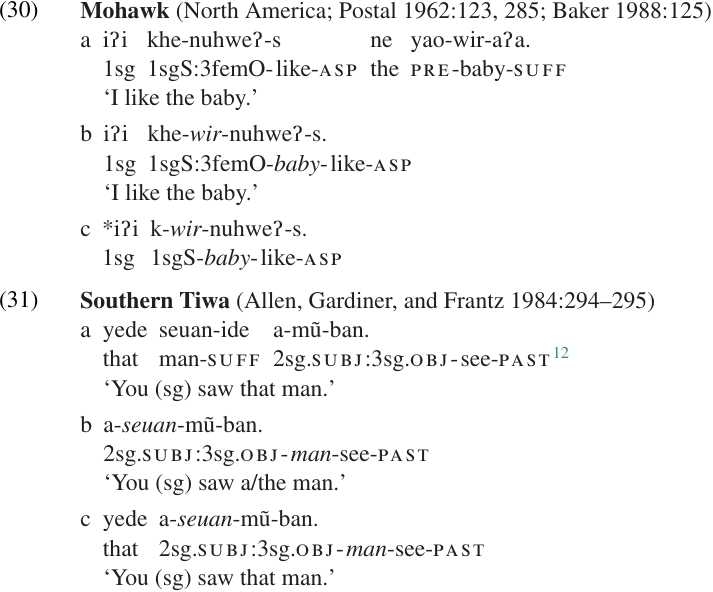In other languages, however, NI does not reduce the valence of the verb. In (30b), for example, we see that the Mohawk verb continues to agree with its OBJ even when the OBJ is incorporated. If the verb is inflected as an intransitive, agreeing only with its SUBJ as in (30c), the sentence is ungrammatical. Similarly, a transitive verb in Southern Tiwa shows the same agreement pattern whether the object is an independent NP (31a) or an incorporated noun (31b). We will refer to this pattern as valence-preserving incorporation.