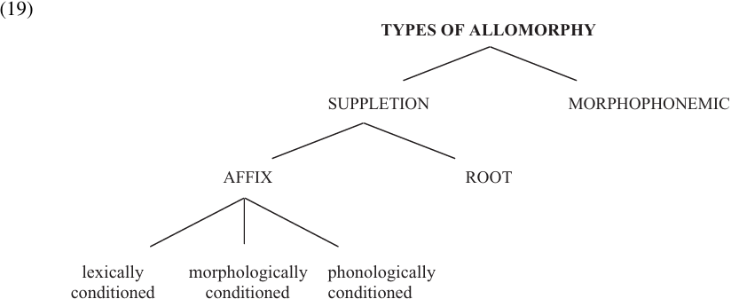 These different types of allomorphy are summarized in (19), which is adapted from Bickford (1998:163). This tree shows a logical way of classifying the various patterns of allomorphy, but it does not necessarily match the procedural order we would follow in analyzing a particular pattern.