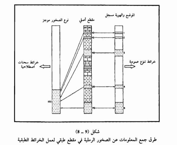 أن الشكل (9 - 8) مقطع طبقي موزع بين الرمل والطفل وغيرها من أنواع الصخور وهناك يعتبر الرمل هو موضوع الاهتمام ولغرض تحضير خارطة سحنية تقليدية تحسب الكمية للرمل في المقطع وذلك باحتساب كافة أجزاء الرمل الموجودة وكأنه كتلة واحدة كما هو مبين.
