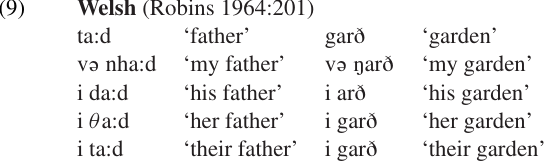 MUTATION refers to a change in the quality of one or more phonemes in the base form. Vowel mutation is relatively common, and is often referred to by the more specific term ABLAUT. German provides many examples, both in nominal forms (singular vs. plural, similar to the English goose/geese) and in the paradigms of the “strong” verbs. A few of the many patterns of ablaut in verb stems are shown in (8). Of course, similar examples are found in English as well: sing/sang, drink/drank, swim/swam, run/ran, eat/ate, etc. These examples are interesting because the change in vowel quality itself is the marker for past tense; at least superficially, there appears to be no past tense affix involved.