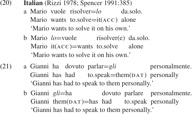 For example, object pronouns in Italian (as in Spanish) generally appear as clitics attached to the verb which assigns their semantic role. In certain constructions, a clitic pronoun which functions as the object of a subordinate verb can optionally appear before the main verb of the sentence (20b, 21b). Spanish is similar, as illustrated in (19). This pattern is often referred to as “clitic climbing,” since the clitic appears to “climb” up to a higher verb. This pattern constitutes strong evidence that the clitic forms are true pronouns, rather than agreement affixes.