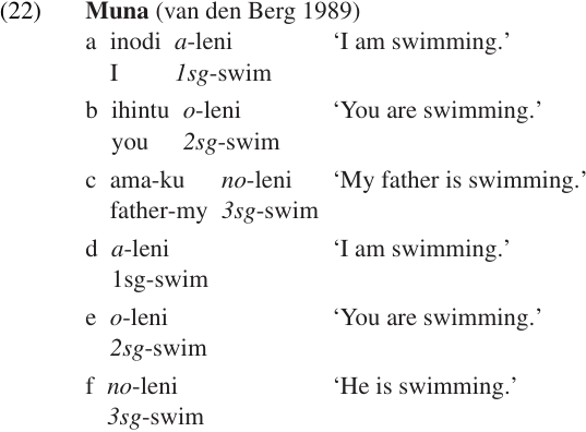 So, while the subject-marking prefixes in Muna have the properties we expect of agreement affixes, the object markers seem more like clitic pronouns. A very similar pattern is reported in the Bantu language Chichewa (Bresnan and Mchombo 1987).