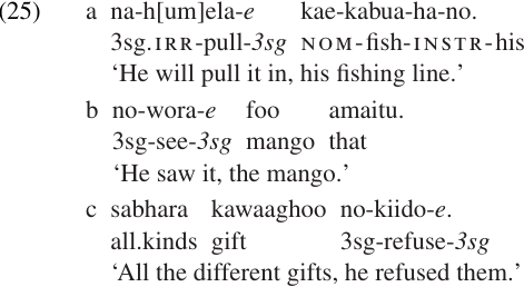The object markers may co-occur with a full NP object phrase, as in (25a, b), but when they do the construction seems to involve a kind of apposition.3 Van den Berg (1989:164) states: “In most of the [se]cases...the direct object [NP] is a known entity that is supplied for the sake of clarification, almost as an afterthought.” This strongly suggests that the verb’s object “suffix” is actually a pronoun, and it is this pronoun which bears the OBJ relation. The “object” NP is actually a kind of appositional or adjunct phrase. This hypothesis is supported by the fact that, when the object NP is topicalized (moved to a pre-verbal position), as in (25c), the verb normally carries an object “suffix” as well.