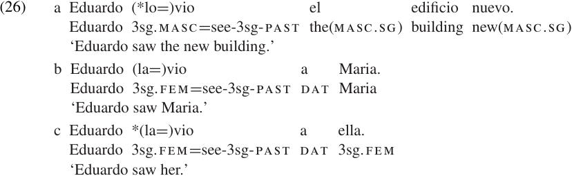 The co-occurrence of a clitic pronoun with a co-referential NP argument is called clitic doubling. Halpern (1998) states that CLITIC DOUBLING in Spanish is impossible when the object is a bare NP (26a), optional when the object is a dative NP (26b), and obligatory when the object is a free pronoun (26c).
