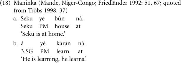 The development in English from because to colloquial English coz is an instance of (17a): It entailed both loss of phonetic segments and reduction from a disyllabic to a monosyllabic unit. Since the eroded form coz does not occur in all varieties of English, there is reason to assume that erosion was a process that took place subsequent to desemanticization and decategorialization. The grammaticalization of the English adjective full to the derivational suffix-ful illustrates (17b), in that it entailed a loss of the ability to be stressed. (17c) can be illustrated with the following example. In the West African language Maninka, a locative construction [X be at Y], illustrated in (18a), has been grammaticalized to a progressive aspect (18b), as has happened in many other languages (Heine 1993; Bybee, Perkins, and Pagliuca 1994; Kuteva 2001). The result is that the copula ye̒ (PM) and the locative postposition na̒ ‘at’ have been reinterpreted as a discontinuous progressive marker. Another result of this process is that na̒ has lost its phonetic autonomy: While it is invariable as a postposition, as a progressive marker it no longer is: It assimilates to the preceding verb, taking the form na when the verb ends in a nasal but la elsewhere, and it has lost its high tone, adopting the tone of the preceding verb.