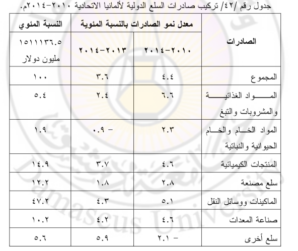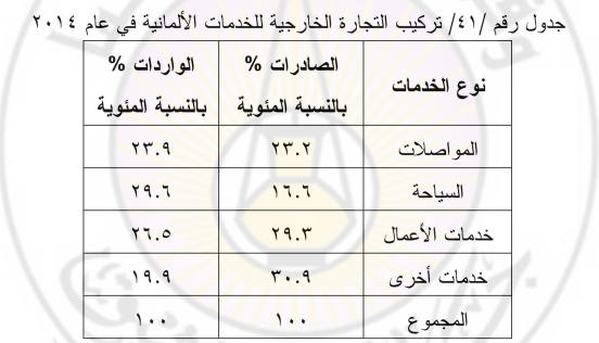 علماً أنه بلغ معدل نمو تجارة صادرات الخدمات الألمانية نحو 4.6 %، بينما تضاعف معدل نمو الواردات التي بلغت نحو 8 % ، وكان تعويض خسارة الميزان التجاري الجزئي بشكل دائم من تجارة صادرات السلع الألمانية والجدول / 41 / يبين تركيب التجارة الخارجية للخدمات الألمانية.