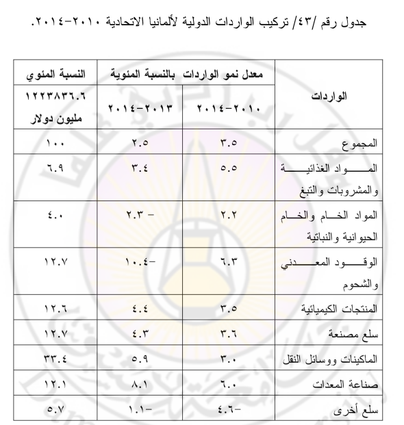 وبعد عام 2010م انخفض معدل نمو الواردات الألمانية، وبخاصة في مجال استيراد النفط والغاز الطبيعي وبمعدل 4. 10% ، بالإضافة إلى استيراد المواد الخام المستخدمة في الإنتاج الصناعي، وذلك بسبب المنافسة الصناعية والتجارية من دول شرق آسيا وبخاصة من الصين الشعبية، ومع ذلك فما تزال ألمانيا تحتل المرتبة الأولى في واردات الاتحاد الأوروبي التي تشكل نحو 54% ، أما بالنسبة للواردات الألمانية فتتمثل في الآلات والسيارات والمنتجـات الكيميائية والمواد الغذائية والمنسوجات، وتشكل المستوردات النفطية والغاز الطبيعي نحو 13% من قيمة المستوردات الألمانية وأهم الدول الموردة للأسواق الألمانية هي هولندا والصين الشعبية وفرنسا والولايات المتحدة وباقي دول الاتحاد الأوروبي. والجدول رقم /43 / يوضح تركيب واردات السلع الدوليــة لألمانيا الاتحادية.