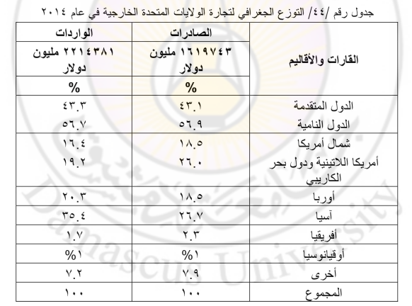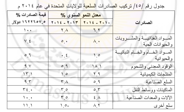 فقد بلغت خسارة الميزان التجاري الخارجي للسلع في الولايات المتحــــدة 785.4 مليار دولار، وبشكل خاص مع دول شرق آسيا، حيث شكلت الخسارة نحو 47% من إجمالي خسارة الميزان التجاري الخارجي لعام 2014م. وتعد الماكينات ووسائط النقل والمنتجات الكيميائية، أهم الصادرات الأمريكية، وبخاصة إلى أسواق دول منطقة التجارة الحرة لشمال أمريكا، فقد صدرت بنسبة 19 إلى كندا و 14.4 إلى المكسيك، وصدرت إلى الصين ما نسبته 7.5% من إجمالي الصادرات الأمريكية لعام (2014م).