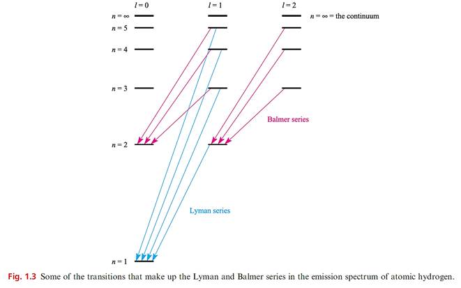 All lines in all the series obey the general expression given in equation 1.5 where n’ > n. For the Lyman series, n = 1, for the Balmer series, n= 2, and for the Paschen, Brackett and Pfund series, n = 3, 4 and 5 respectively. Figure 1.3 shows some of the allowed transitions of the Lyman and Balmer series in the emission spectrum of atomic H. Note the use of the word allowed; the transitions must obey selection rules, to which we return in Section 20.6.