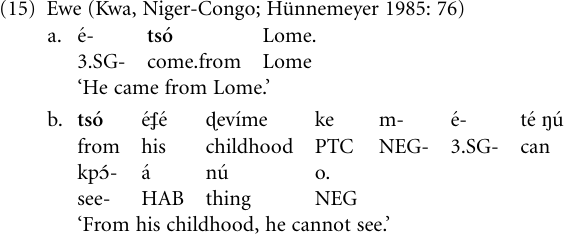 Paradigm cases of the verb-to-adposition pathway can be found in analytic-isolating languages of, for example, southeastern Asia and western Africa: In these languages, the verb is uninflected both in its lexical-verbal and in its adpositional uses. The following example illustrates the process concerned. In the Ewe language of Ghana and Togo, the verb tso̒ ‘to come from’ has been grammaticalized to a source preposition ‘from’. Example (15a) shows tso̒ in its lexical use as a motion verb, while (15b) exhibits its grammaticalized use as a functional category: Verbs in Ewe cannot occur without a formal subject (except for imperatives), nor can they appear sentence-initially; in its use as a preposition, however, the item tso̒ can, as (15b) shows.