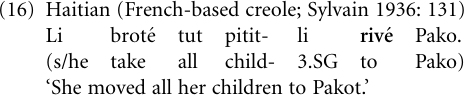 Evidence for this pathway can also be found abundantly in creole languages, such as the following example from Haitian, where the allative preposition rive̒ ‘to’ is historically derived from the French motion verb arriver ‘arrive’: