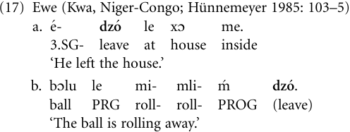 For more examples of this kind from verb to adverbial modifier from languages in other parts of the world, see Heine and Kuteva (2002a). What all these cases have in common is that the second verb in a verb–verb construction is desemanticized, whereby its lexical meaning is reduced to some specific schematic function (like ‘away’ in example (17b)), and decategorialized, in that that verb loses most or all of the verb properties characterizing its lexical use (like the ability of dzo̒ to be used in the progressive aspect).