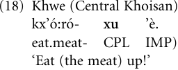 Verb > aspect Most languages of the world have undergone this process, whereby lexical verbs assume the function of an auxiliary of other verbs and turn into markers for aspect functions such as progressive, durative, habitual, completive, perfective, iterative, and the like. There is a rich literature on this grammaticalization process (e.g. Bybee, Perkins, and Pagliuca 1994; Kuteva 2001). We briefly discussed an example from English in “The present approach” concerning the item keep, which is a lexical verb in most of its uses (e.g. He kept the money), but has also been grammaticalized to a durative aspect auxiliary when combined with main verbs (He kept complaining). In the following example from the Khoisan language Khwe (or Kxoe̒), the verb xŭ ‘to leave, abandon, loosen’ has been grammaticalized to a completive (terminative) aspect marker when serving as an auxiliary of another verb: It has lost its lexical meaning in favor of a schematic aspectual function, and it has been decategorialized to a verbal derivational suffix-xu: