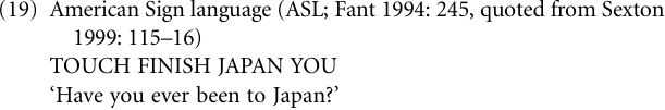 But crosslinguistically verbs meaning ‘finish’ that give rise to completive, perfect, and perfective aspect markers are more common (Bybee, Perkins, and Pagliuca 1994; Heine and Kuteva 2002a). This is also a process that has happened in a number of signed languages, such as American Sign language (ASL),2 and Italian Sign Language (Janzen 1995; Sexton 1999; Morford 2002: 331; Pfau and Steinbach 2006), for example: