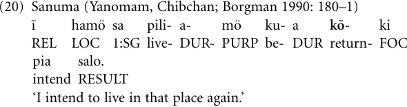 Suffice it to add an example of a specific but widespread pathway of grammaticalization whereby verbs meaning ‘to return, come back’ develop into iterative (or repetitive) markers when combined with other verbs. In the Central American Chibchan language Sanuma, the lexical verb kõ ‘return’ has given rise to a repetitive marker when in combination with other verbs: