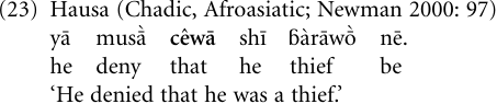 Verb > complementizer Next to demonstratives (see below), lexical verbs provide one of the most important sources for the development of markers introducing complement clauses. Since we will be dealing with this pathway of grammaticalization in more detail in “The verb channel”, we are confined here to one example. Speech act verbs meaning ‘say’ or similative verbs meaning ‘be like’, ‘be equal’, or ‘resemble’ are the ones that commonly give rise to complementizers (see Heine and Kuteva 2002a: 257–8; 261–5; 273–5). The following example from the West African language Hausa illustrates the use of a ‘say’-verb as a complementizer: The verb cê ‘say’ is used in its nominalized form cêwā to present complement clauses (though not when the main clause verb is cê):