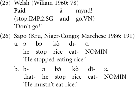 Verb > negation The development of negation in French, where the noun pas ‘step’ (as well as a set of other nouns) was introduced as an optional pseudo-object reinforcing the inherited pre-verbal negative particle ne, later turning into the primary means of expressing verbal negation (Schwegler 1988; Hopper and Traugott 1993: 58–9), is usually cited as a paradigm example of how negation markers arise. Crosslinguistically, however, this pathway, leading from noun to negative particle is not really common, even if it is widespread in European languages (Ramat and Bernini 1990); perhaps the main way in which new negation markers evolve is via the grammaticalization of verbs. In many cases, the process is confined to modally marked contexts, especially to prohibitive or negative imperative constructions, where verbs meaning ‘stop’ are reinterpreted as negation markers. The following example from Welsh illustrates this case of restricted grammaticalization: The verb peidio ‘cease, stop’ has acquired the function of a prohibitive auxiliary, as in (25). Similar cases abound in the Kru languages of West Africa (Marchese 1986; Heine and Kuteva 2002a: 283–4); example (26) is representative of this situation, where (26a) shows the lexical and (26b) the functional use of the verb.