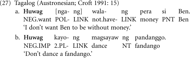 Negative imperatives and prohibitives have a number of other verbal sources in addition, in particular verbs of negated volition, that is, negative verbs of desire, such as Latin nōlı̄, the imperative of ‘not want, be unwilling’ which introduces negative imperatives. In the following example from the Philippine language Tagalog, the item huwag expresses negative desire in a declarative sentence such as (27a), but a negative imperative in (27b) (see Croft 1991: 14–16 for more details).