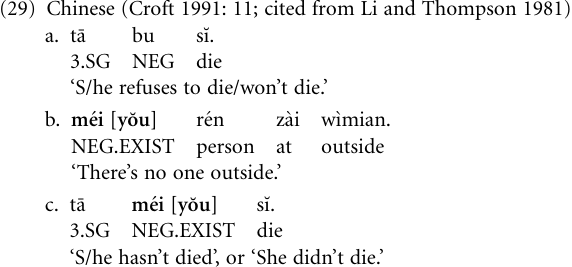 In a number of languages, however, the new negation marker is not generalized to all contexts but remains restricted to certain tenses or aspects. The negative existential bâ ‘there is not’ of the Saharan language Kanuri of Nigeria, for example, seems to have developed into a negation marker of the imperfective aspect, while in the perfective there is a different negation marker (-nyi). In Chinese, the ‘‘normal’’ declarative negation marker is bu, illustrated in (29a), while the negative existential me̒i [yŏu] (cf. (29b)), consisting of the special negator me̒i and the existential/possessive verb yŏu, appears to have been grammaticalized to a negation marker of completed actions, cf. (29c).