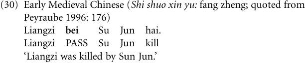 4 Originally, bei was a noun meaning ‘blanket’, later it turned into a verb meaning ‘to cover’, ‘to wear’, before it acquired the meanings ‘to receive’, ‘to suffer’, ‘to be affected’ (Peyraube 1996: 176).