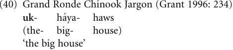 In this process, desemanticization has the effect that the demonstrative loses its deictic (locative) content, such as the ability to express relative distance (e.g. proximal vs. distal). Via decategorialization, the demonstrative loses its independent status, becoming an appendage of its head noun, it changes from free word to clitic, and eventually it may turn into an affix. Finally, erosion may enter the process as well, in that the erstwhile demonstrative tends to be shortened and loses the ability to carry stress. A canonical instance of such a process can be observed in Chinook Jargon: the general demonstrative u̒kuk ‘this, that’ (deictic pronoun) was grammaticalized to a definite article uk- in Grand Ronde Chinook Jargon. This process involved three of the parameters distinguished above: The demonstrative lost its deictic semantics (desemanticization), its status as an independent word, becoming an NP-prefix (decategorialization), and it also lost in phonetic substance (erosion), in that u̒kuk was reduced to uk-.1