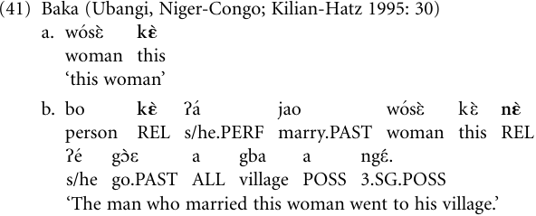 The following example from the Central African language Baka illustrates the grammaticalization process. In example (41a), the proximal demonstrative kὲ ‘this’ serves as a nominal determiner, which like all other modifiers follows its head noun. In (41b), the same item serves as a pronoun that is used to present the following clause. The resulting relative clause is bracketed in that in addition to the clause-initial relativizer there is a clause-final marker nὲ, diachronically an adverb meaning ‘here’.