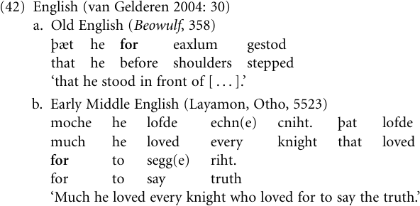 Adposition > complementizer As we will see in more detail in “Expansion”, prepositions and postpositions, being heads of noun phrases, commonly develop into markers of complement clauses, that is complementizers. For example, for was a preposition of location and purpose in Old English, as in (42a), but came to be used as a complementizer by early Middle English, cf. (42b) (van Gelderen 2004: 30).