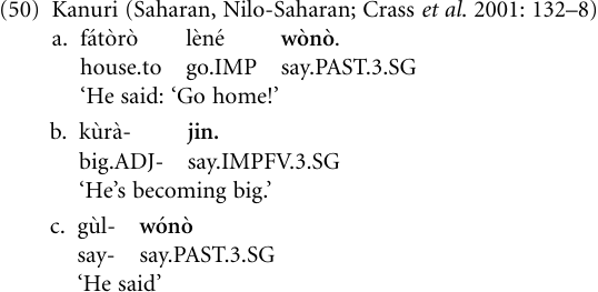 The following example, being a special instance of the Verb > complementizer pathway, illustrates what may happen in the final stages of the process. The more a verb in combination with another verb loses in meaning content, the more it tends to merge with the other verb, and in the end the two may lexicalize into a new verb. In the Saharan languages of the Nilo-Saharan family, a verb for ‘say’ has been added productively to other verbs, adjectives, and nouns serving as its complements, one of its functions being to derive verbs from other word categories.1 In the course of this process, the ‘say’-verb has merged with its complement to the extent that it has lost its meaning entirely, the result being a new verb. The following example from the Nigerian Kanuri illustrates the various stages of development. Sentence (50a) shows the lexical use of the verb, (50b) that of ‘say’ as an element deriving (inchoative) verbs from adjectives (in this case, ku̒rà ‘big’), and (50c) illustrates the use of ‘say’ as a semantically empty inflectional appendage of a verb, that is, its erstwhile complement.