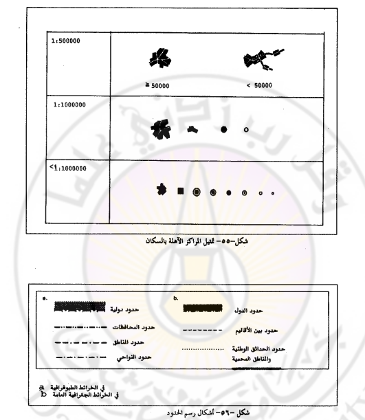 ـ الحدود الإدارية من الدرجة الثانية : قد تكون حدود المقاطعات أو المحافظات ، وقد تكون حدود المناطق أو حدود الفروع البلدية الحدود الإدارية من الدرجة الثالثة قد تكون حدود المناطق الإدارية للنموذج الاتحادي من الدول، وحدود النواحي للدول المقسمة الى محافظات ومناطق و نواحي الحدود الإدارية من الدرجة الرابعة ومثالها حدود القرى إن درجة التفصيل في رسم الحدود على الخرائط الجغرافية العامة تتعلق بمقاييس هذه الخرائط والمنطقة التي تشملها ووظيفة الخريطة فعلى الخرائط العامة التي تبين العالم بأكمله، أو قارة بكاملها يكفي رسم الحدود السياسية لكل دولة، العاصمة السياسية لها، وبعض المدن الكبرى إن وجدت وسمحت مساحة ووضع الدول بذلك. أما على الخرائط التي تبين مجموعة غير كبيرة من الدول، يتم رسم الحدود السياسية والحدود الإدارية من الدرجة الأولى ، وتحدد العاصمة السياسية والمراكز الإدارية للتقسيمات المرسومة أما على خرائط كل دولة على حدة ، فان التقسيمات الإدارية المرسومة قد تصل الى الدرجة الثالثة إذا كان مقياس الخريطة ومساحات التقسيمات تسمح بإظهارها ، وقد يكفي إظهار التقسيمات الإدارية من الدرجة الأولى فقط. وترسم الحدود بأشكال مختلفة على الخرائط العامة، ولكن من المفضل أن إن أنصف القط المـتتبع الأشكال المبينة في الشكل السابق وإن أضيف إليها خطوط متصلة ملونة لإظهارها بشكل أوضح. وفي هذا الإطار نرى أن رسم الحدود بخطوط متصلة مختلفة السماكات قد يؤدي الى الخلط بين الرموز الدالة على الحدود وتلك الدالة على طرق المواصلات مثلا وننصح دائما باستخدام الخطوط المبينة في الشكل السابق لرسم الحدود بأشكالها فقط.