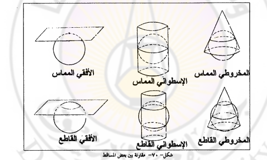 ـ مساقط عادية ينطبق فيها محور سطح الإسقاط على محور الكرة، ويتعامد مع خط الاستواء مساقط معترضة استوائية ينطبق فيها محور سطح الإسقاط علــى خـط الاستواء، ويتعامد مع محور القطبين المساقط مائلة.