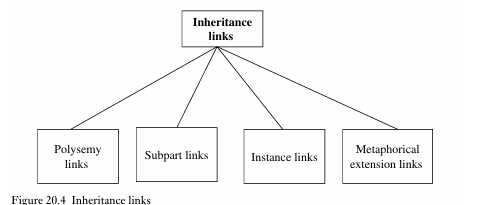 The term ‘motivation’ reflects the degree to which the properties of a given construction are predictable. In other words, given the premise that grammatical constructions are meaningful, it follows that constructions that share grammatical properties will to some extent also share semantic properties. The Principle of Maximised Motivation is a psychological principle. In order to explain how language observes this principle, Goldberg posits inheritance links within the network of constructions that comprise knowledge of language: ‘construction A motivates construction B iff B inherits from A’ (Goldberg 1995: 72). There are four different kinds of inheritance links, which are shown in Figure 20.4. We will examine each of these in turn.