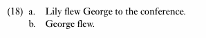 Example (18a) is an instance of the caused motion construction. Example (18b) is an instance of the intransitive motion construction. While (18a) lexically profiles the argument roles CAUSE (Lily), THEME (George) and GOAL (the conference), (18b) lexically profiles only the THEME (George). In this sense, the construction illustrated in (18b) is a proper subpart of the construction in (18a). Thus the relationship between the two constructions is captured by a subpart inheritance link.