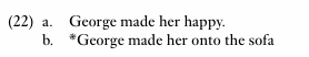 The similarity between these two construction types revolves around the interpretation of the result phrase (the adjective phrase (AP) senseless in example (20a)) as a type of metaphorical GOAL, parallel to the actual GOAL expressed by the PP in the caused motion construction (onto the sofa, in example (20b)). In other words, the resultative construction encodes a metaphorical movement towards a GOAL or a metaphorical change of location. As Goldberg observes, this parallel is further supported by the fact that resultatives do not permit GOAL PP phrases. This can be accounted for by the fact that the result phrase already expresses the (metaphorical) GOAL, so the expression of an additional GOAL is redundant. This is illustrated by the unacceptability of example (21).