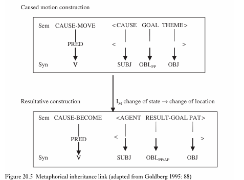 links Goldberg argues that some constructions are metaphorical extensions of other constructions, and that metaphorical extension therefore gives rise to a further type of inheritance link. For example, she argues that the resultative construction in (20a) is a metaphorical extension of the caused motion construction in (20b).