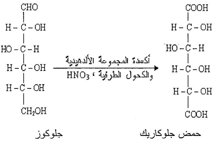 ومن الممكن ان تتم أكسدة السكريات على كل من المجموعة الألدهيدية (-CHO) والكحول الطرفية أو الأخير (CH2OH) في ان واحد اي تحول الجلوكوز إلى حمض الجلوكاريك أو حمض السكاريك كما يلي: