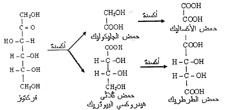 اما السكريات الكيتونية (Ketoses) فتتأكد بالمؤكسدات القوية فقط (لأن مجموعة الكربونيل C = 0 ليس بها هيدروجين قابل للأكيدة) معطية أكثر من حمض بحيث يكون مجموع ذرات الكربون للأحماض الناتجة مساوياً لعدد ذرات الكربون في السكر الكيتوني الأولى علماً أن الأكسدة تحدث عند المجموعة الكيتونية، مثال أكسدة سكر الفركتوز (بواسطة حمض الجليكوليك (Glycolic acid) والآخر يسمى حمض ثلاثي هيدروكسي البيوتريك (Trihydroxy butyric acid) وباستمرار الاكسدة لهذه المركبات ينتج لدينا حمض الاكساليك (Oxalic acid) وحمض الطرطريك (Tartaric acid) كما في التفاعلات اللاحقة: