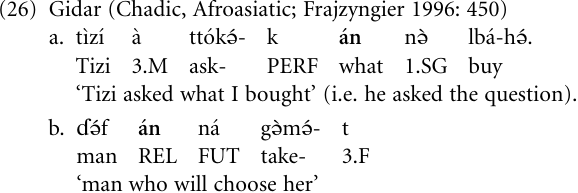 In the Chadic language Gidar, one of the two relative markers, a̒n (26b), is identical with the interrogative pronoun for ‘what?’ (26a), and we hypothesize that this is an instance of the interrogative-to-relative channel.