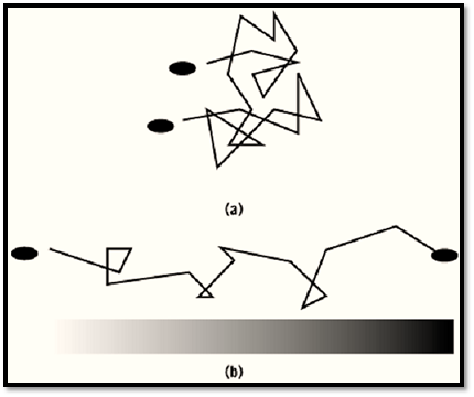 Figure 1. Motion of peritrichous bacteria. (a) Random walk in an isotropic medium. (b) Biased random walk in a gradient of an attractant or repellent.