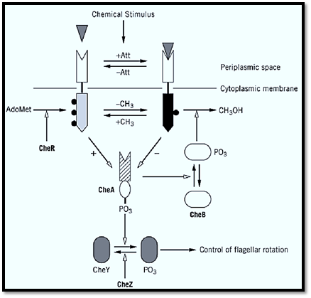 Figure 2. Diagram of the mechanism of chemotaxis in Escherichia coli. Open arrows indicate control of the designated reaction or signaling step. At the top, the attractant (Att) binds to its transmembrane chemoreceptor, which is methylated on Glu residues. The methyl groups are depicted as closed black circles. This binding decreases the phosphorylated form of the protein CheA (center), which decreases phosphorylation of the proteins CheY and CheB. Dephosphorylated CheB is much less active in removing the methyl groups from the chemoreceptor, so CheR restore them. Phosphorylated CheY dissociates from the switch that controls flagellar rotation, and smooth swimming ensues. CheZ hydrolyzes the phosphoryl group from CheY, ending the response to the attractant.