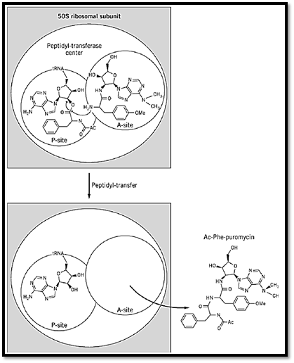 Figure 2. The puromycin reaction. A peptidyl-tRNA analogue [eg, Ac[14C]Phe-tRNA) bound to the ribosomal P site of 50S ribosomal subunit reacts with puromycin (an aminoacyl-tRNA analogue) bound to the A site of the peptidyl-transferase center. The resulting peptidyl-puromycin (eg, Ac[14C]Phe-puromycin) is falling of the 50S subunit and can be separated from the substrate (Ac[14C]Phe-tRNA) by extraction.