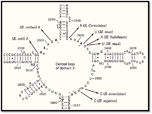 Figure 4. Interaction of chloramphenicol with the central loop of domain V of 23S rRNA. The secondary structure of the central loop of domain V in E. coli 23S rRNA is derived from phylogenetic sequence comparisons. Differences in the accessibility of bases to chemical reagents in the presence and absence of chloramphenicol (footprints) are shown in red (–, protection of base; +, enhanced activity). Mutations leading to chloramphenicol resistance are indicated by arrows, and the corresponding organisms are indicated in brackets. All of the eukaryotic mutations were characterized for mitochondrial rRNA. (Figure derived from Refs. 11 and 12.)